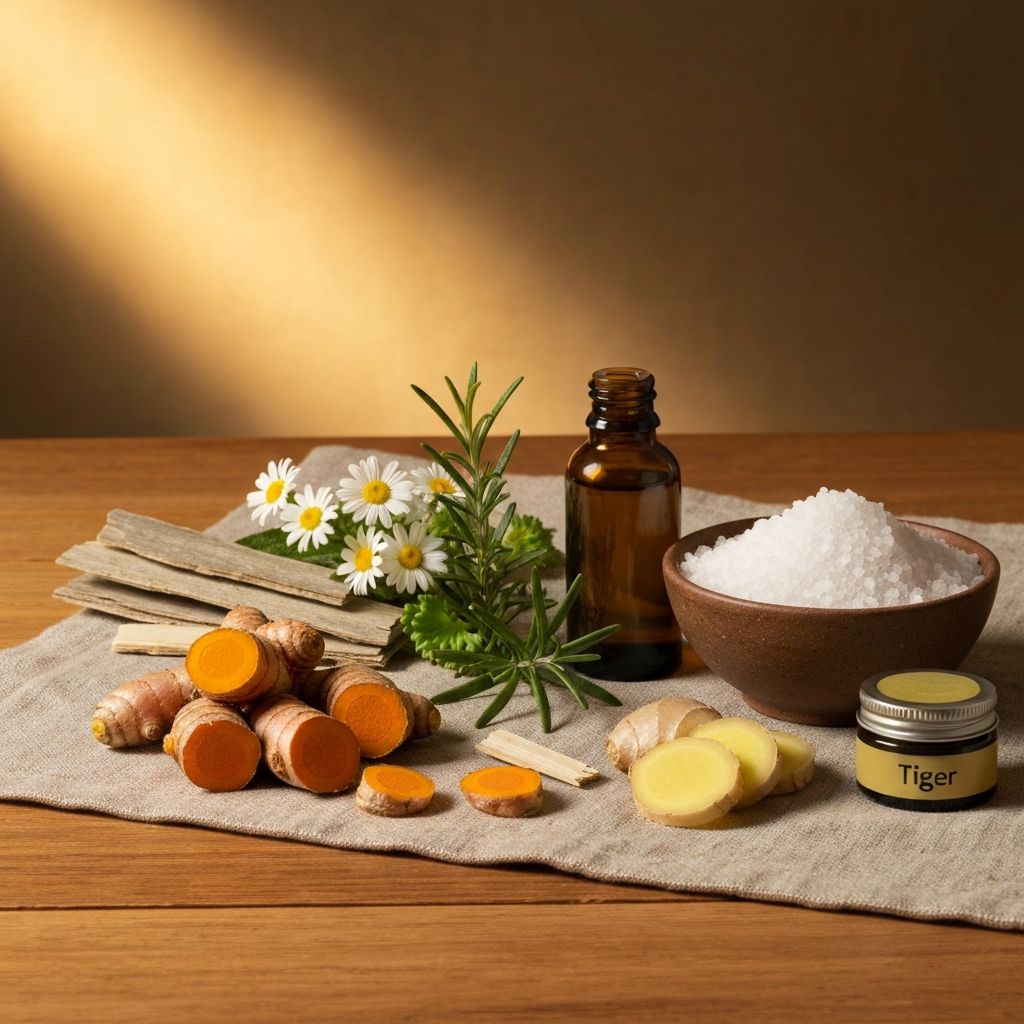 Gavez (Symphytum) sadrži alantoin koji ubrzava regeneraciju tkiva pri topikalnoj primjeni. Kapsaicin iz ljute paprike blokira supstancu P, neurotransmiter boli. Arnika smanjuje otekline i modrice. Eterična ulja eukaliptusa, ružmarina i borove smole poboljšavaju lokalnu cirkulaciju. Epsom sol (magnezijev sulfat) u kupkama opušta mišićne spazme. Fizikalna terapija, vježbe istezanja i umjereno kretanje ključni su za dugoročno poboljšanje.